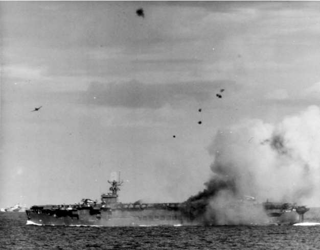 The escort carrier USS Suwanee is hit by crashing Japanese aircraft during the Battle of Leyte Gulf.